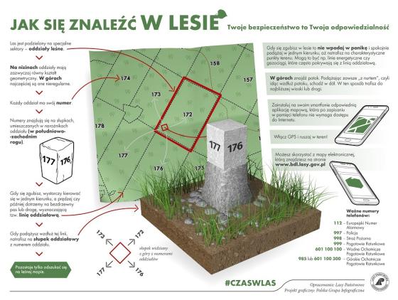 Przed wyjściem do lasu dobrze jest zaopatrzyć się w mapę leśną, którą wcale nie tak trudno zdobyć. Kolorami są tam oznaczone gatunki drzew, można odczytać wiek drzewostanu, a przede wszystkim numer oddziału leśnego. Łatwo ustalić w terenie w jakim oddziale jesteśmy, bo w południowo-zachodnim narożniku każdego oddziału znajdziemy słupek oddziałowy, gdzie na białym tle czarną farbą wypisane są numery okolicznych oddziałów. Gdy nie masz mapy ani kompasu, słupek pozwoli z łatwością ustalić kierunek północny. Gdy na słupku są numery czterech oddziałów to narożnik pomiędzy dwoma najniższymi numerami wskazuje północ. Znajdziesz wtedy drogę do domu bez problemu.