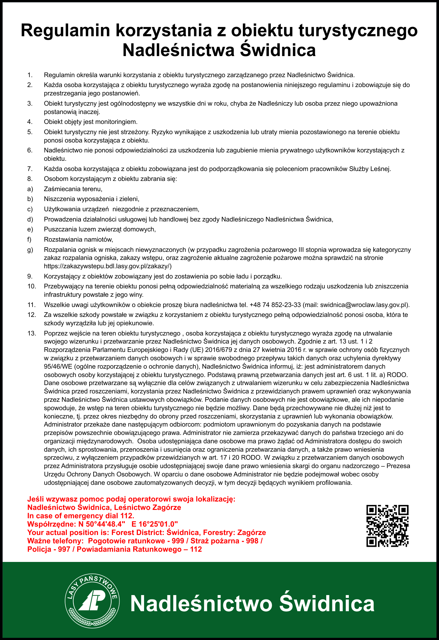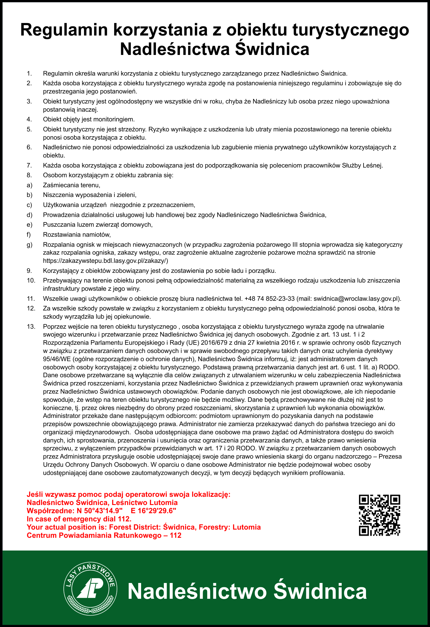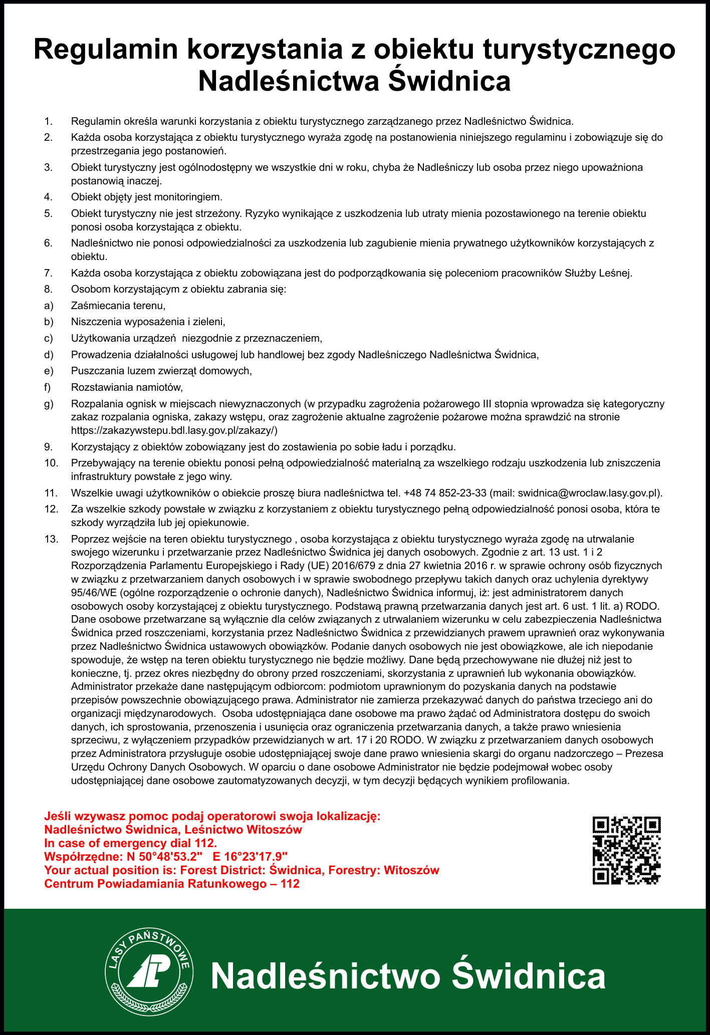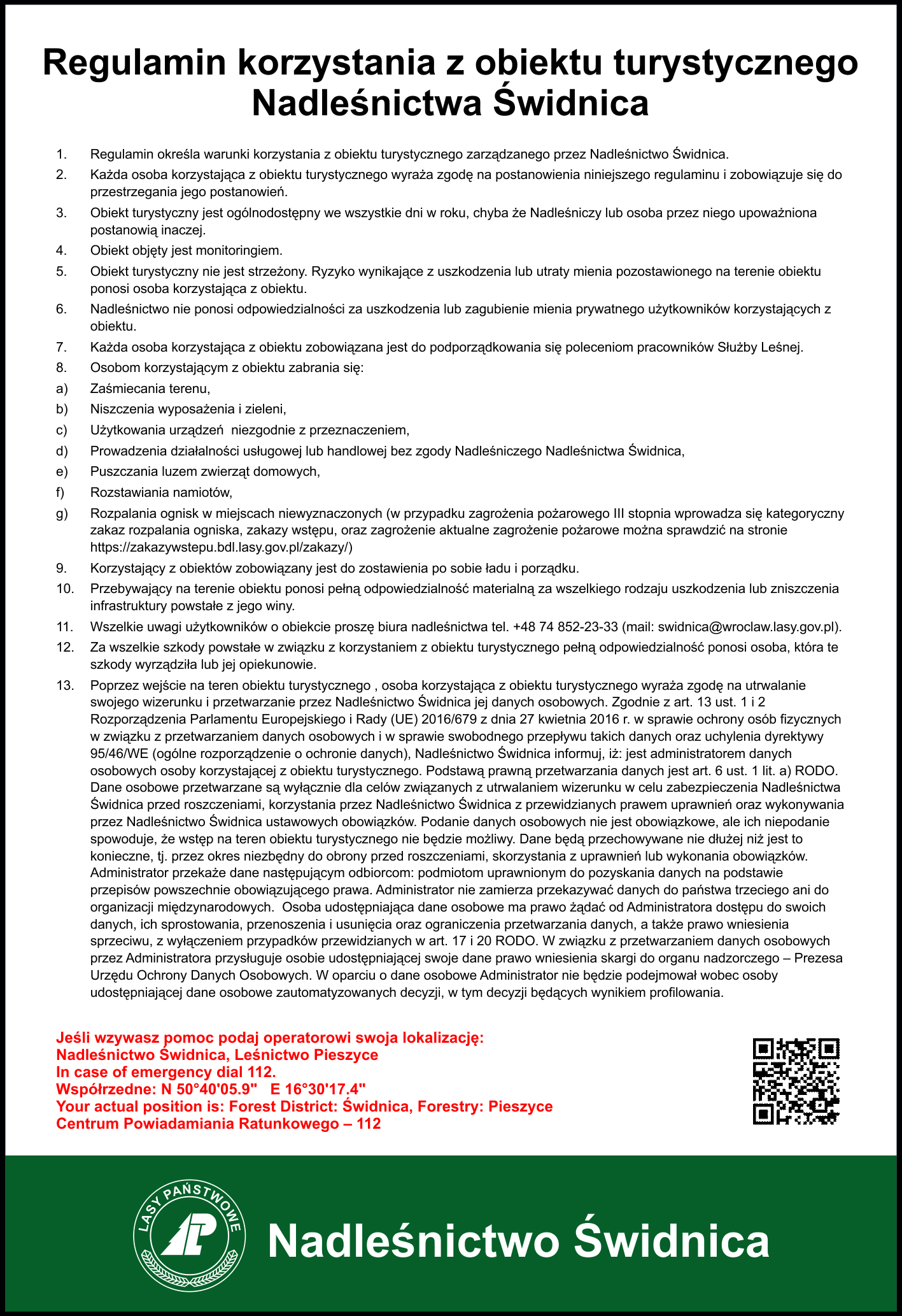 Regulaminy miejsc i obiektów turystycznych zarządzanych przez Nadleśnictwo Świdnica.